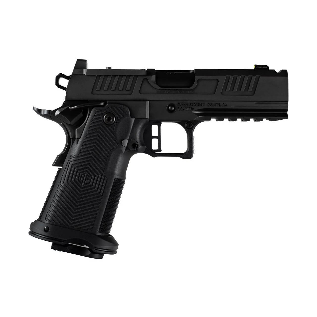 $614.00Alpha Foxtrot AF1911-Romulus MOS Adapter Handgun 9mm Luger 17(1) & 20rd(1) Magazines 4.25″ Ported Bull Barrel DLC Black