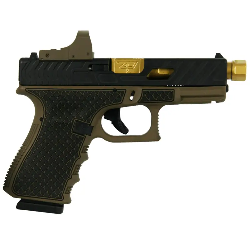 $928.99Glock 19 Gen 3 Custom “Threaded Gold Barrel Tarpon FDE Frame” Handgun 9mm Luger 15/rd Magazines (2) 4.6″ Barrel with Burris Fast Fire II Red Dot Austria