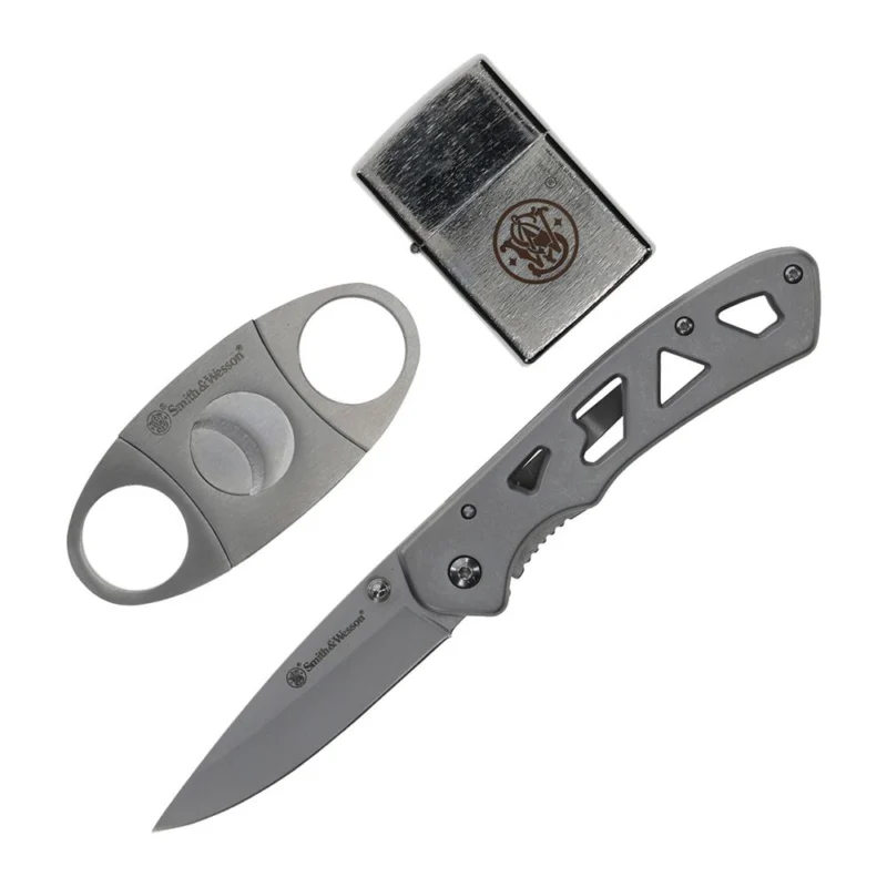 Smith & Wesson Folding Knife Cigar Cutter and Lighter Combo 3″ Drop Point Blade Silver