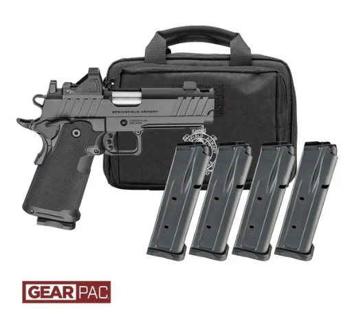 Springfield Armory, MFG# PH9117AOS-COMP-PAC, UPC: 706397999889, UOM: EA, 1911 DS Prodigy AOS, 9mm, 4.25″ Barrel, Compensated, OR, Viridian RFX11, Black, Gear Pac, (3)17 & (1)20-rd, SPRI, SPRIHG10, SPRIHGALL, HG10, HGALL