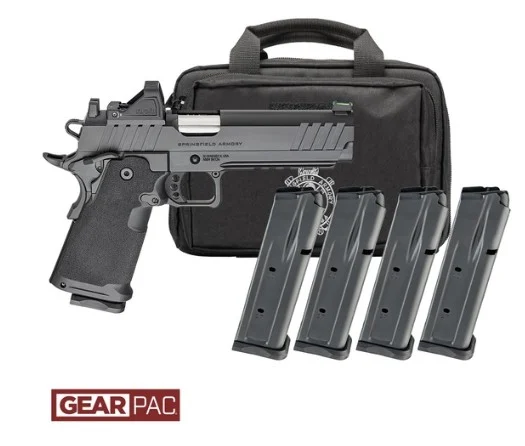 Springfield Armory, MFG# PH9119AOS-PAC, UPC: 706397999551, UOM: EA, 1911 DS Prodigy AOS, 9mm, 5″ Barrel, OR, Viridian RFX11, Black, Gear Pac, (3)17 & (1)20-rd, SPRI, SPRIHG10, SPRIHGALL, HG10, HGALL