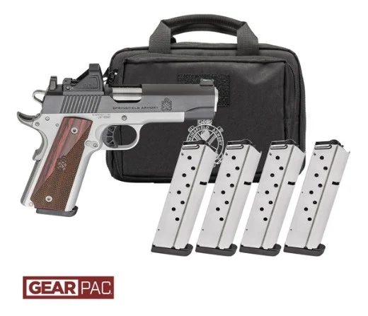 Springfield Armory, MFG# PX9118LAOS-PAC, UPC: 706397999971, UOM: EA, 1911 Ronin AOS, .45 ACP, 4.25″ Barrel, Viridian RFX11, Blued, Stainless, Wood, Gear Pac, (4) 8-rd, SPRI, SPRIHG10, SPRIHGALL, HG10, HGALL